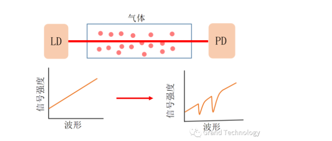 冠德科技开发的碳同位素分析仪巧妙利用一种新型激光器对气体进行碳同位素分析,如下图所示,没有被气体吸收的光信号是一条直线,光被气体吸收后产生特殊的波形,经过复杂的拟合计算得出被测气体的同位素数据。
