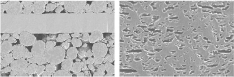 离子切割后的电池材料截面揭示其内部结构,左图电池阳极极片,右图电池隔膜,SEM图像,能源电池材料领域。